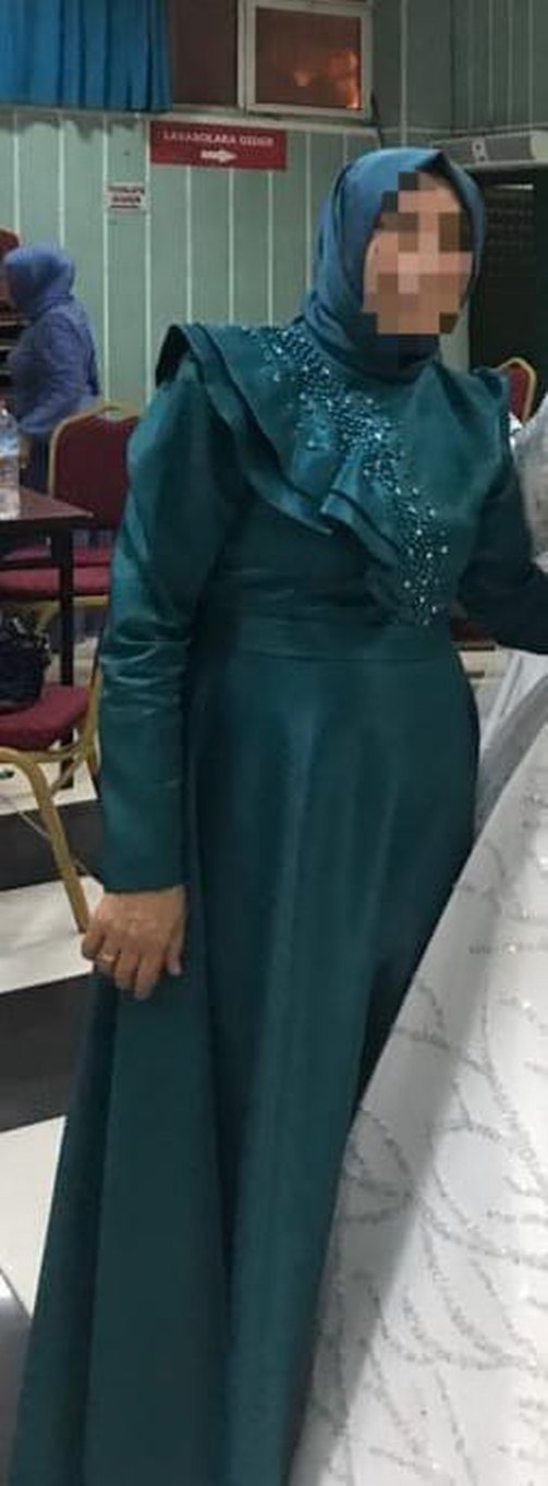 Turkuaz İşlemeli Uzun Kollu Abiye Elbise