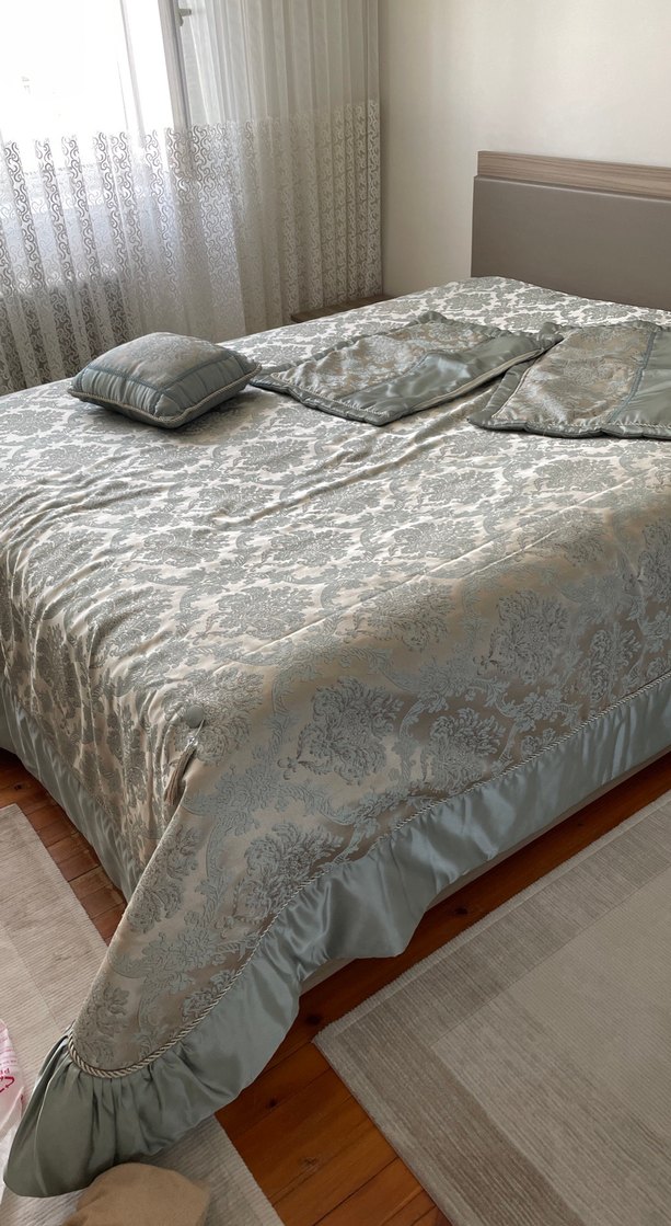 İnce işlemeli desenlere sahip gri yatak örtüsü, yumuşak ve şık dokusuyla dikkat çeker. Uyumu sağlayan yastıklar da dahildir. ️