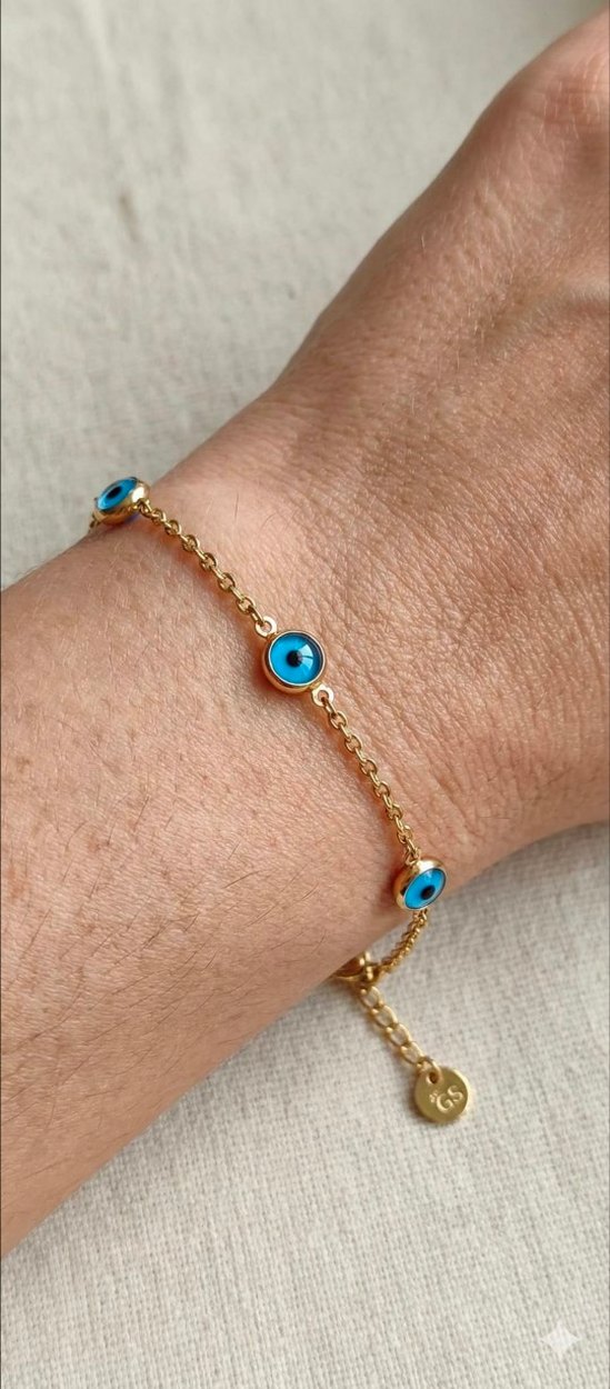 Bohem tarzda, turkuaz işlemeli göz motifli ince altın zincir detaylı kadın bilekliği. Renkli ve minimal, günlük kullanıma uygun. 316 L çeliktir. Kararma yapmaz. Antialerjeniktir. Denizde ve havuzda rahatlıkla kullanabilirsiniz