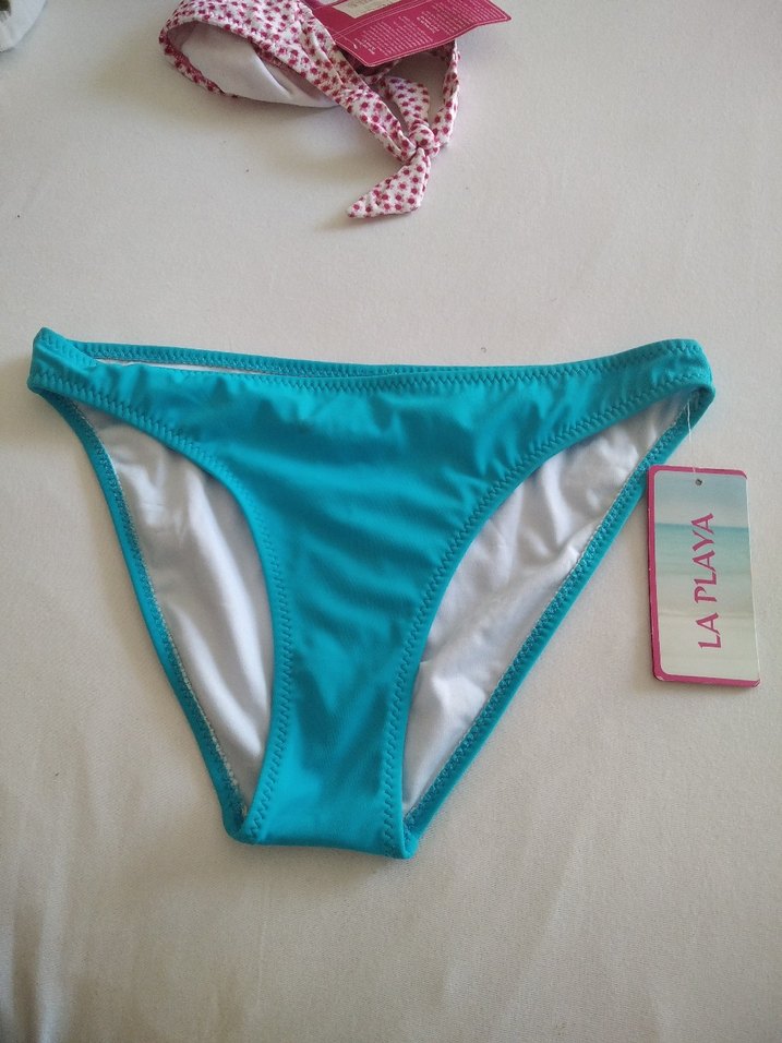 Turkuaz renkli, ince askılı ve vücuda oturan kadın bikini altı. Renkli ve rahat plaj şıklığı sunar. La Playa markası.