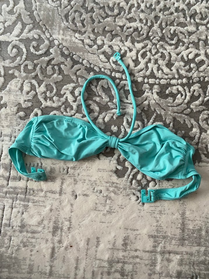 Fiyonk detaylı, askılı ve turkuaz renkte, bohem tarzına uygun, normal uzunlukta ve vücuda oturan bikini üstü.