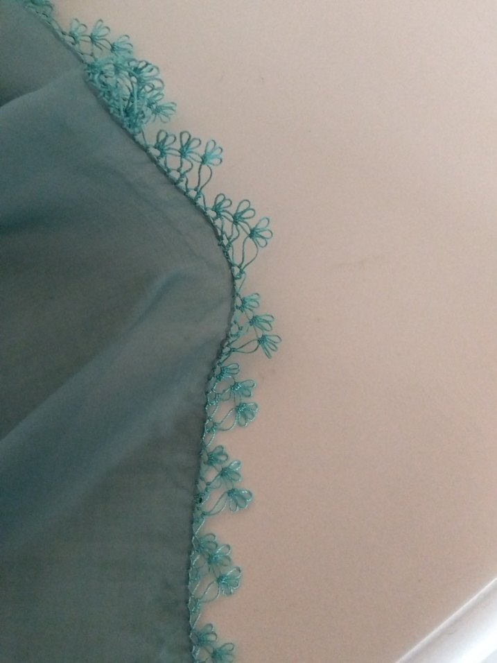 Turkuaz renkli, etnik dantel detaylı ve dokulu kumaştan drapeli kadın şalı.
