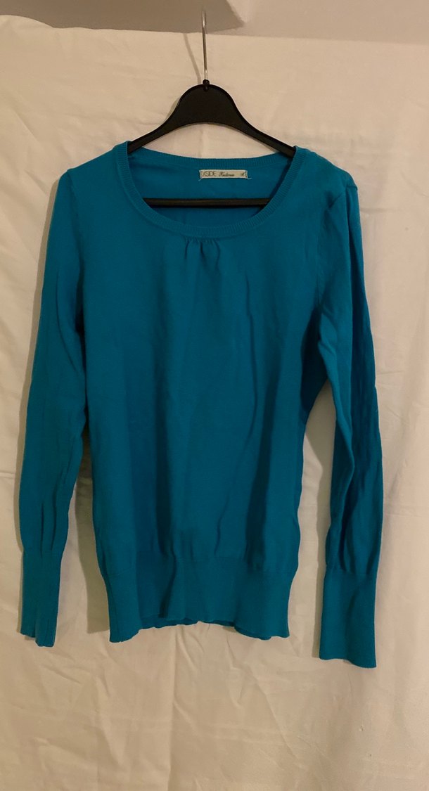 Turkuaz renkli, keten kumaştan, yuvarlak yaka ve uzun kollu kadın kazak. Rahat kesimli ve normal boyda, sade ve şık bir görünüm sunar. Günlük kullanım için uygundur.