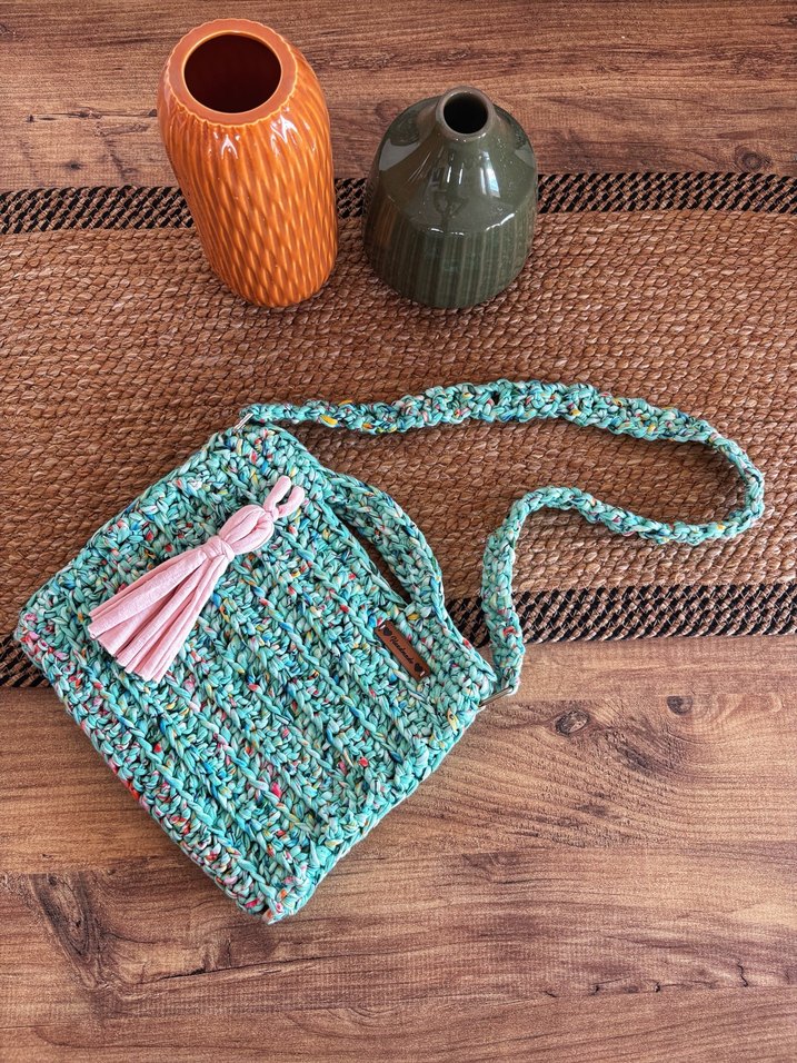 Turkuaz renkte, pastel tonlarda tie-dye desenli, örgü askılı bebek çantasıdır. Pembe püskül detayı ile süslenmiştir. Penye iple örüldü. Sıfır ürün.