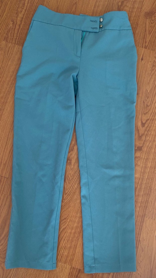 Turkuaz renkte, normal boy midi uzunluğunda kadın kumaş pantolon. Parlak sentetik kumaştan, kemerli ve sade tasarıma sahip, ofis için uygun.