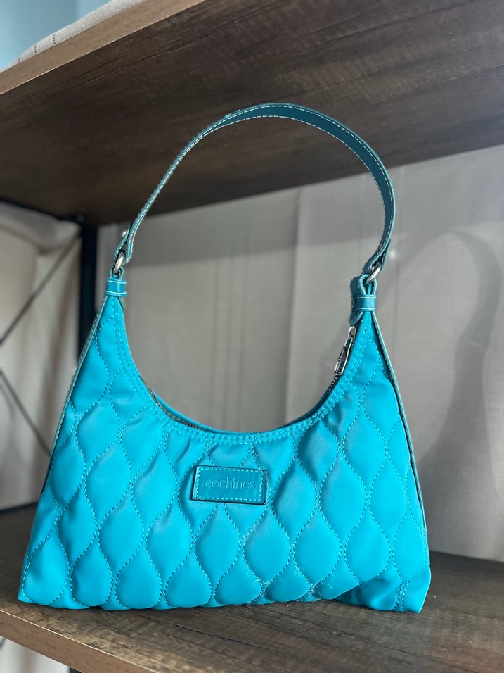 Turkuaz renkli, yumuşak sentetik kumaştan yapılmış, tokalı askıya sahip minimalist kadın omuz çantası. Günlük sokak stili için uygun. -sıfırdır-paketlidir
