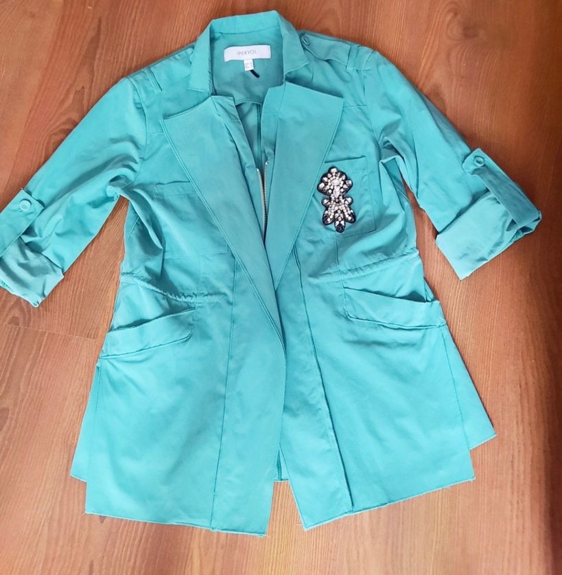 Turkuaz pamuklu blazer ceket, kesilmiş yaka ve düğmeli kapama ile. Uzun kollu, midi boyda, pastel tonlarda ve cep süslemeli. Ofis ve günlük şıklık için uygun.iki ker giyilmiştir iki kol arası 48cm boy 70cm