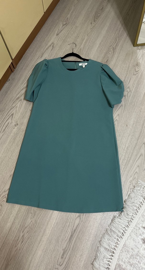 Turkuaz renkli, kısa kollu, yuvarlak yaka ve salaş kesimli kadın midi elbise. Dökümlü detaylara sahip, yumuşak sentetik kumaştan üretilmiştir.