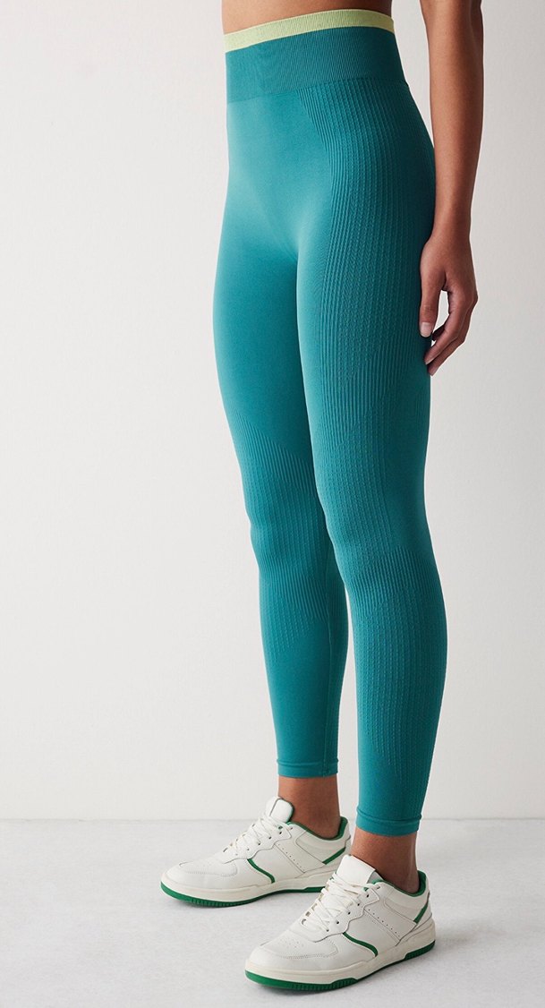 Turkuaz renkte, düz ve sentetik kumaştan üretilmiş, sportif ve günlük kullanıma uygun, modern ve şık kadın taytı. ♀️