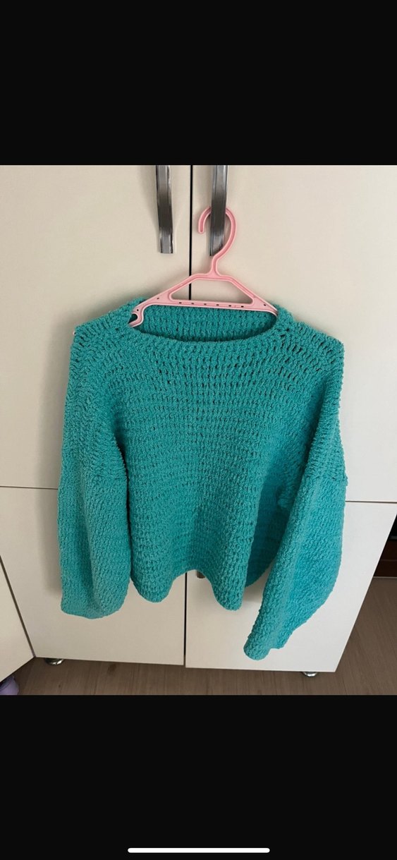 Turkuaz renkli, yuvarlak yakalı, uzun kollu ve bol kesim triko kazak. Rahat ve gündelik kullanım için uygun. El örgüsüdür hiç giyilmedi