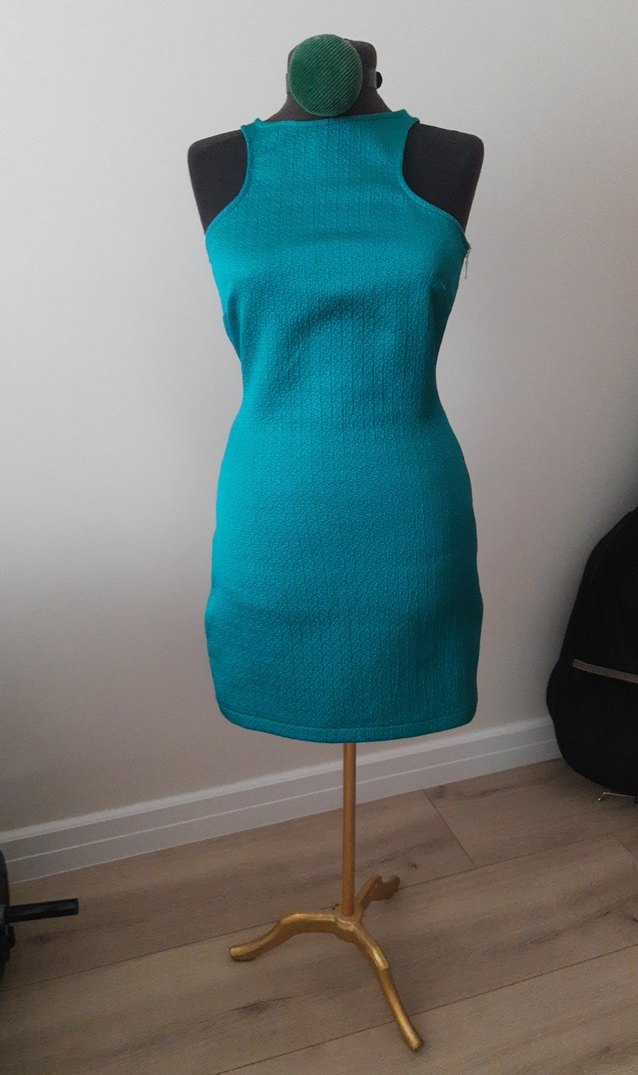 Fitted kesim, yüksek yakalı, kolsuz turkuaz strech elbise, günlük ve gece kullanıma uygun minimal ve çağdaş tarz sunar. elbise mankende çok iyi durmadı ama şık bir elbise
