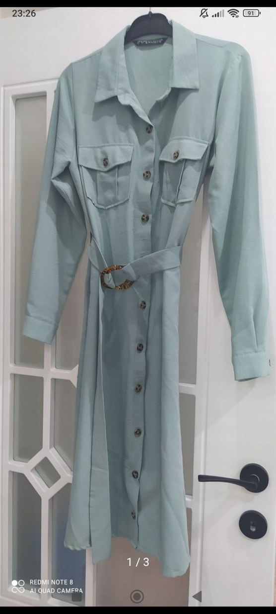 Turkuaz renkli, uzun kollu, kemerli ve regular fit kesime sahip bu elbise, yumuşak sentetik kumaştan yapılmıştır. Paris tarzı günlük rahat şıklık sunar.