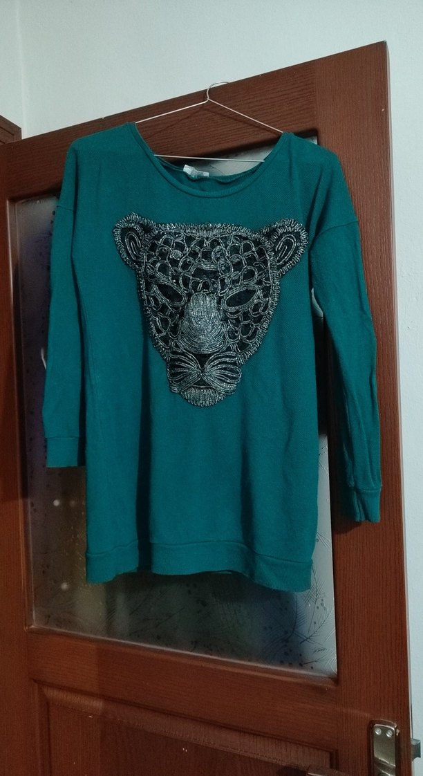 Turkuaz renkli, uzun kollu, yuvarlak yaka ve bol kesim kadın tunik Önde basılı leopar yüzü deseni bulunur, günlük kullanıma uygundur.