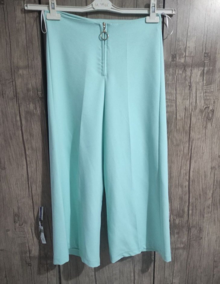 Turkuaz renkte, düz kesim ve fermuarlı önüyle kadınlar için uzun kumaş pantolon. Minimalist ve şık, ofis kullanımı için uygun.