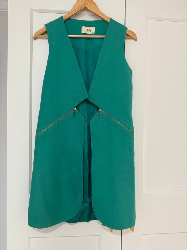 Parlak turkuaz renkte, çıtçıtlı yakalı ve fermuar detaylı kadın yelek . normal kesim ve midi uzunlukta, modern ve minimal tarzda. ✨