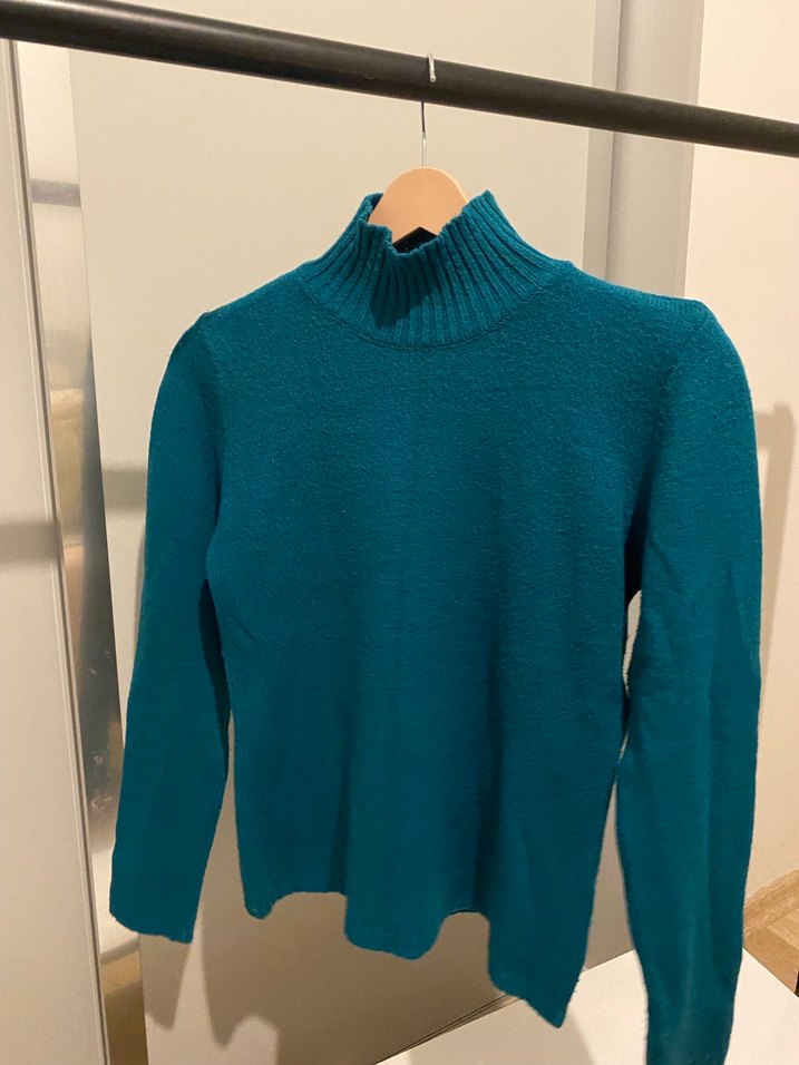 Bu turkuaz renkli, boğazlı ve uzun kollu kazak, yumuşak yünden örülmüş. Günlük rahatlık için normal boyda ve vücudu saran kesimde.