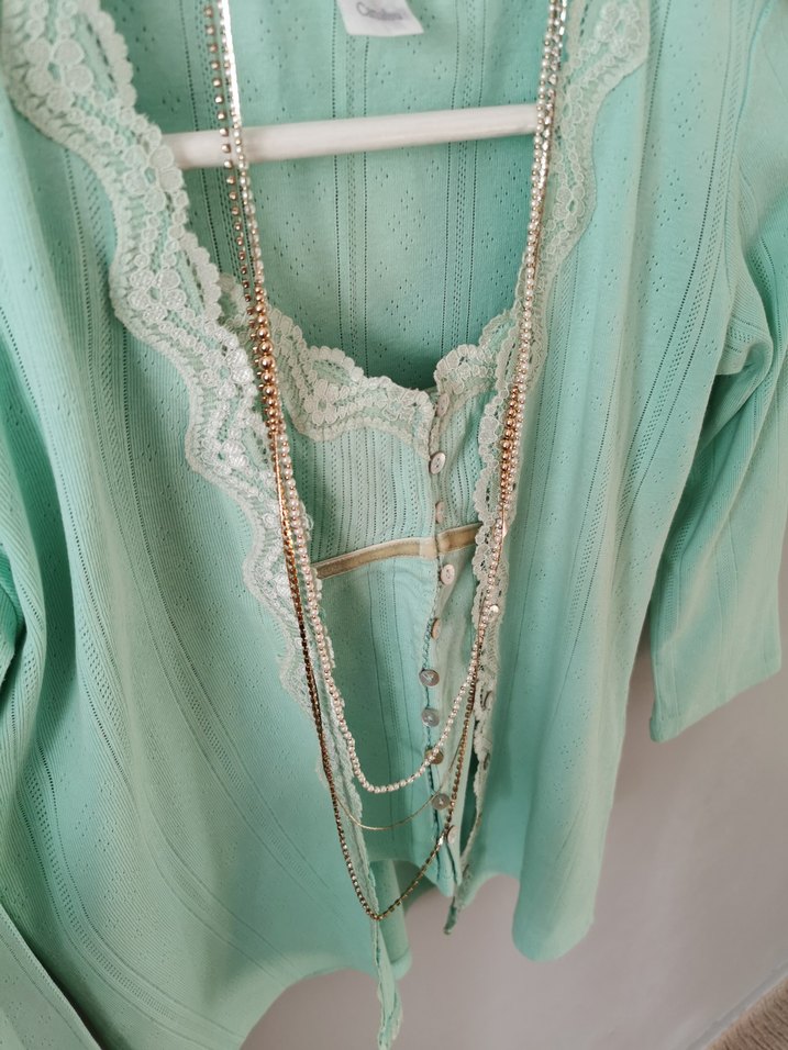 Turkuaz renkte, zincir detaylı kadın vücut zinciri. Bohem ve vintage tarzını yansıtan pastel tonlarda, günlük kullanıma uygun.