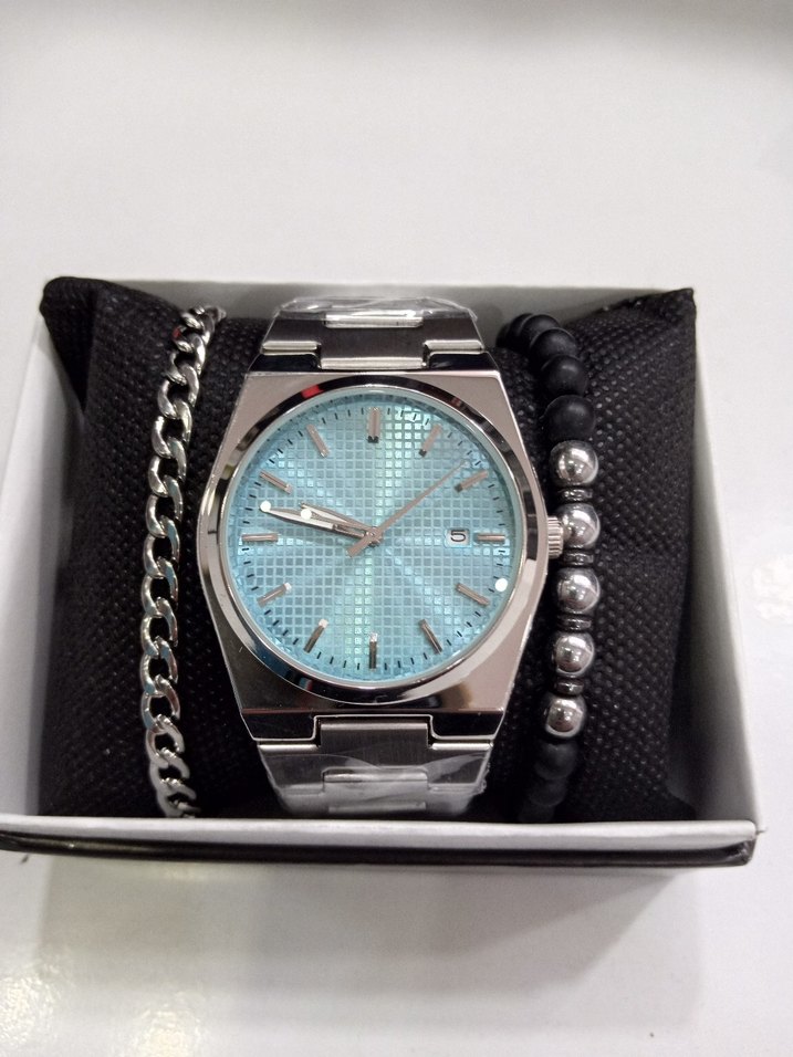Turkuaz kadranlı erkek saat, gümüş renk çelik kayış ve siyah-silver tonlu iki bileklikten oluşan renkli aksesuar seti. ⌚