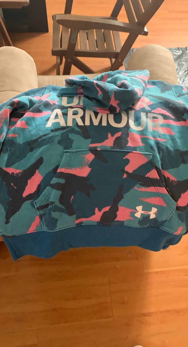 Turkuaz kamuflaj desenli, kapüşonlu, uzun kollu ve dar kesim sweatshirt. Sentetik kumaştan, spor ve günlük kullanıma uygun, fermuarlı cep detaylı.