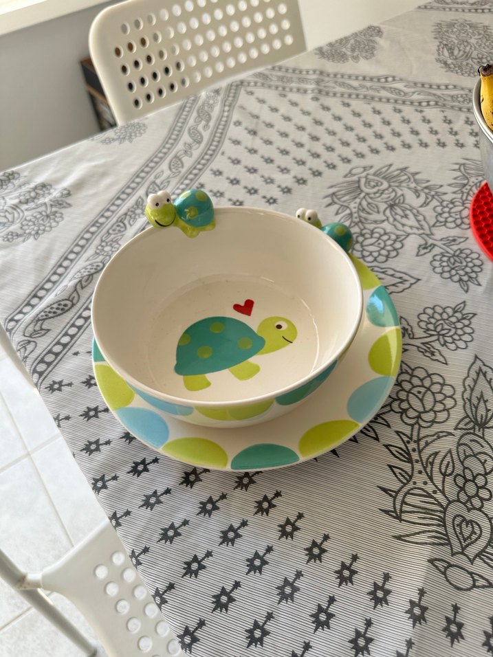 Turkuaz renkli kaplumbağa desenli, çocuklar için renkli tabak ve kase seti. Paşabahçeden alındı. Kırık yoktur