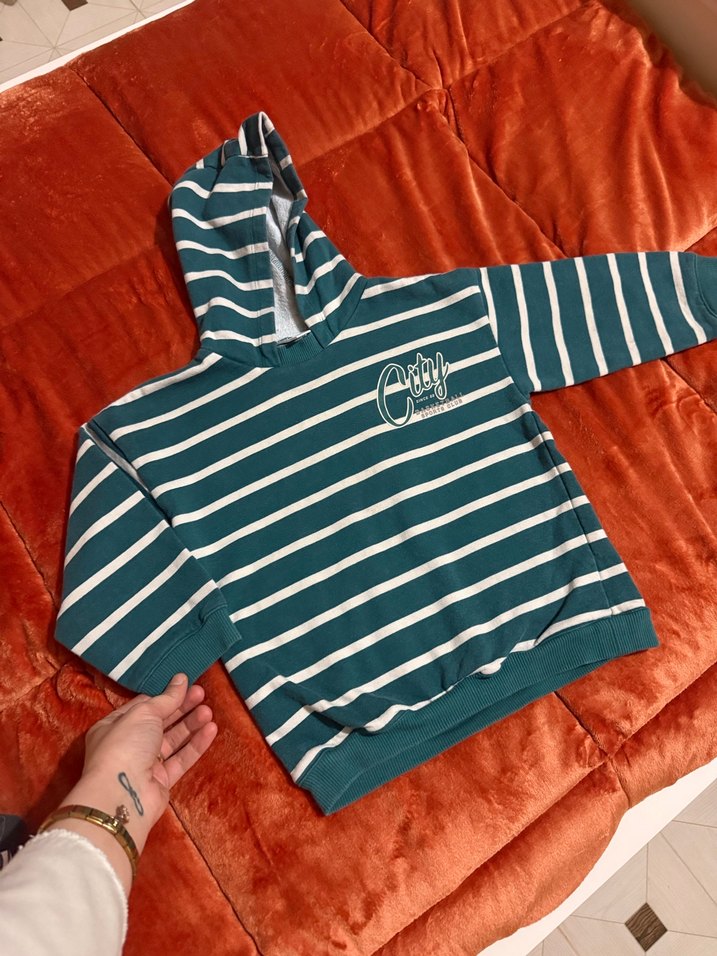 Uzun kollu, kapüşonlu ve fermuarlı bu erkek sweatshirtü turkuaz çizgili baskıya sahip, yumuşak ve sıcak kumaştan üretilmiştir. Rahat kesim ve günlük sokak stili için uygundur.
