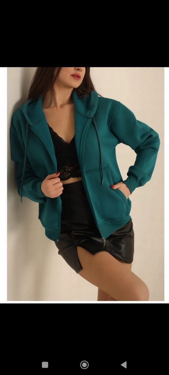 Turkuaz renginde, kapüşonlu ve fermuarlı kadın sweatshirtü. şardonlu
