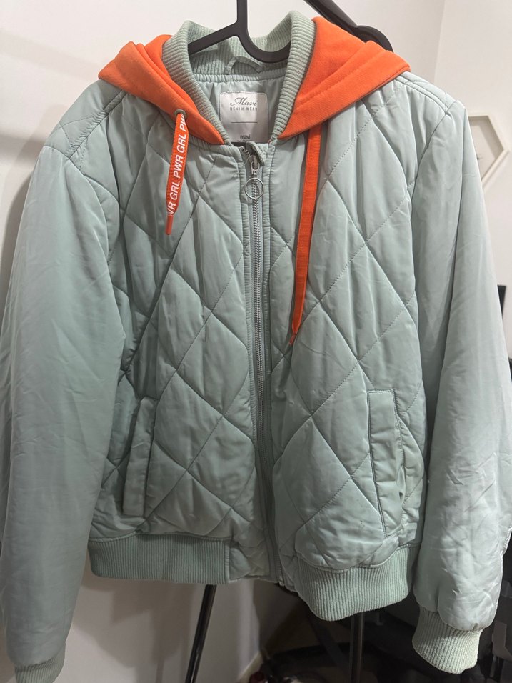 Turkuaz kapüşonlu kadın streetwear mont, fermuarlı ve uzun kolludur. Turuncu kapüşon astarı ve bağcıklarıyla rahat ve salaş bir kesime sahiptir.