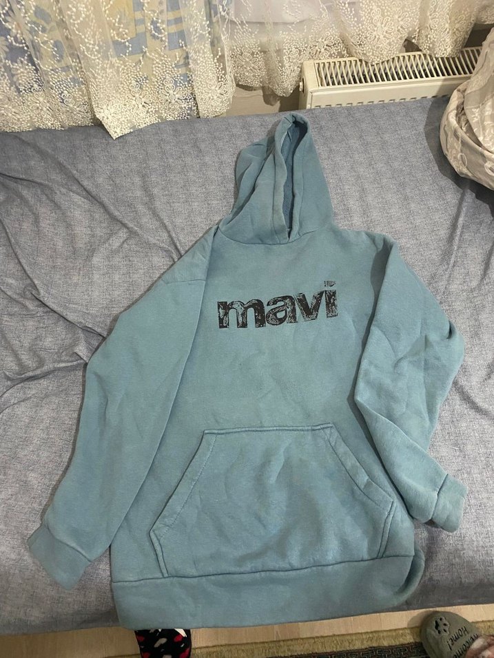 turkuaz kapüşonlu sweatshirt, bol kesim ve örgü dokusuyla. Önünde 'mavi' baskısı, uzun kollu ve kanguru cepli, yumuşak ve sıcak kumaştan yapıldı.