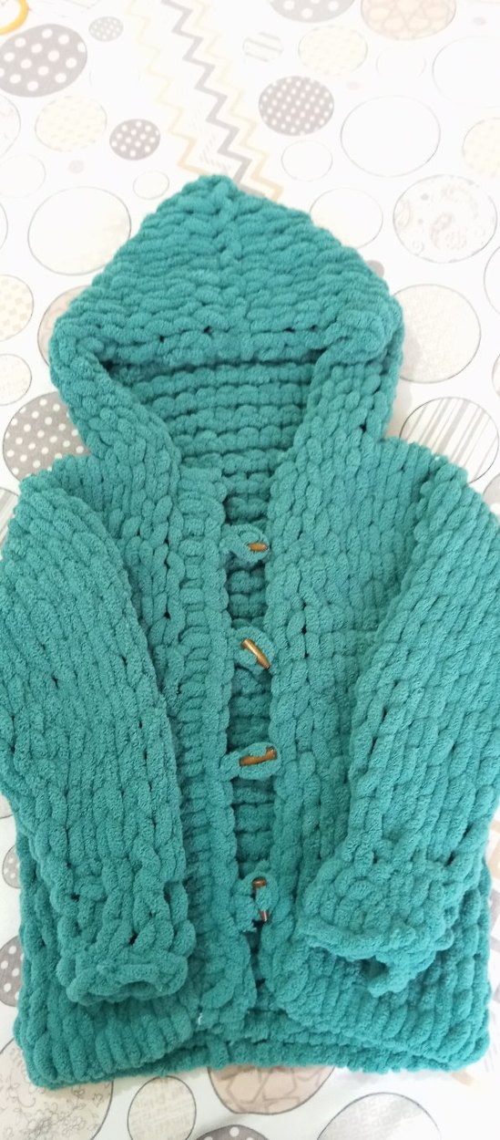 Bohem tarzı, uzun kollu, kız ve erkek ortak renk Turkuaz renkli, örgü kumaştan, kapüşonlu ve ahşap düğmeli. puffy ipten yapılmıştır yumuşacık ve sıcacık tutar gerçekten çok hoş bir duruşu var 3ve 4 yaş uyumludur