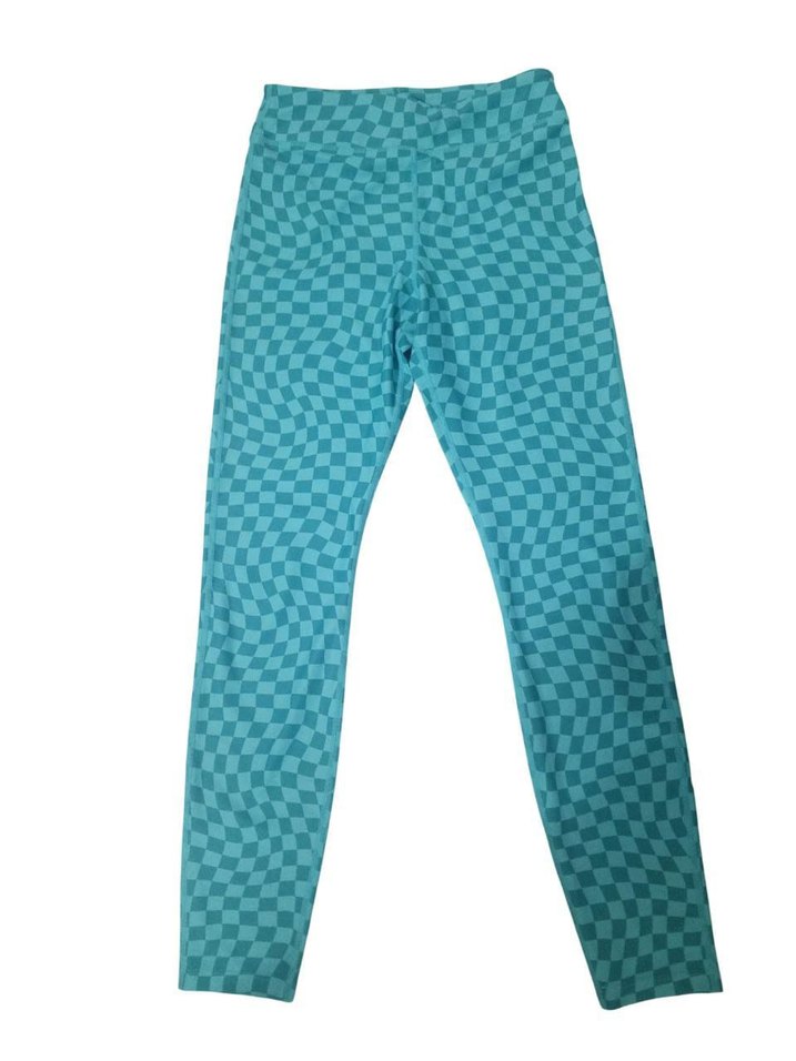 Pastel tonlarda kare desenli, turkuaz renkli, sentetik kumaştan yapılmış, spor ve günlük şık görünüme uygun, vücuda oturan kadın tayt.