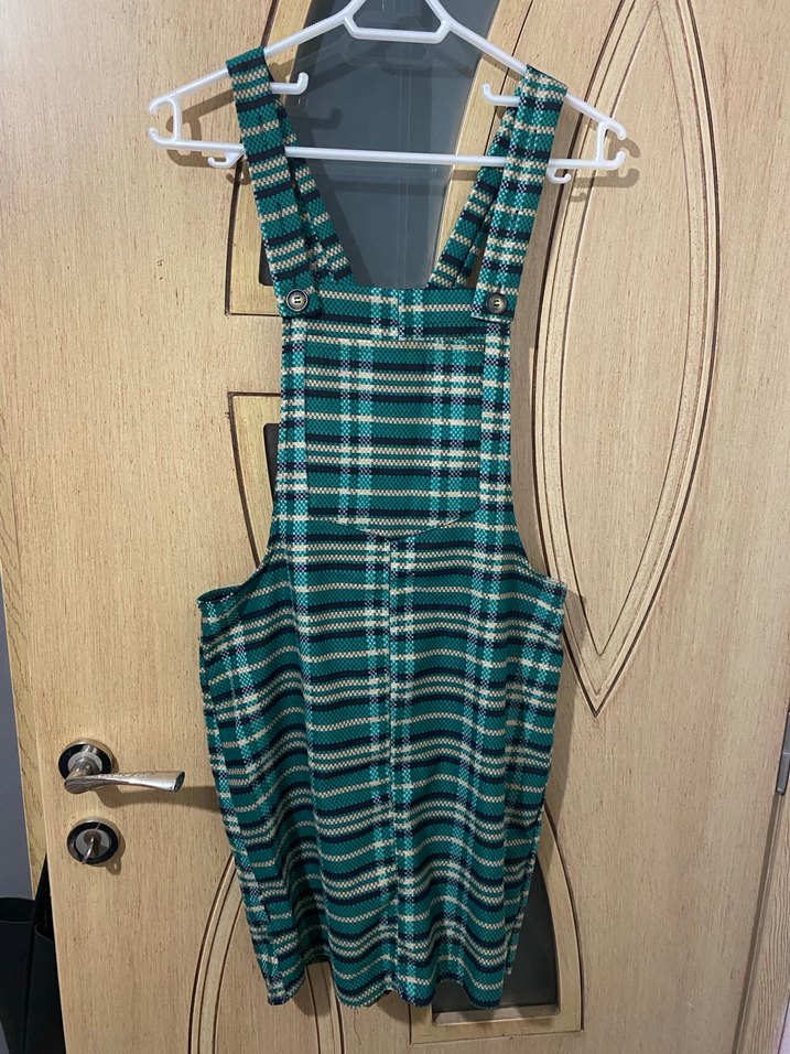 Turkuaz kareli, bol kesim tulumu, askılı ve tokalı detaylı, midi boy ve günlük sokak stili için uygundur.