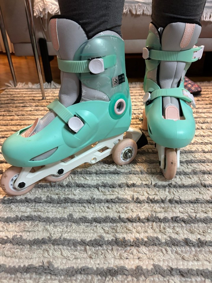 Turkuaz renkte, tokalı kaykay patenleri, kauçuk tabanlıdır. Spor ve sokak tarzı için uygundur.kask,dizlik,dirseklik,eldiven full set (S beden )Paten 2 defa kullanıldı diğer ekipmanlar sıfır hiç kullanılmadı.34-36 numara paten
