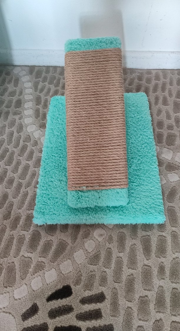 Yumuşak tabanlı ve doğal halat yüzeyli turkuaz kedi tırmalama tahtası. Kediler için rahat ve dayanıklı oyun alanı sağlar.