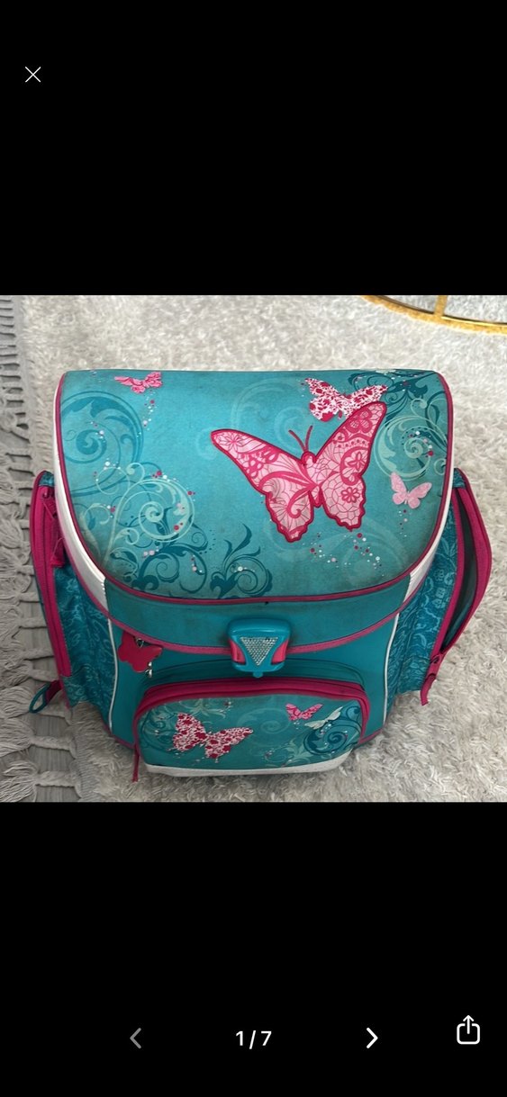 Turkuaz renkli çocuk sırt çantası, pastel kelebek desenli ve çoklu bölmelidir.