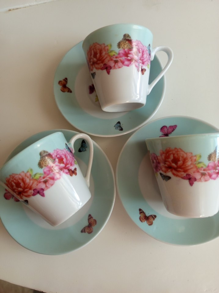 Pastel turkuaz renkte, çiçek ve kelebek desenli 3'lü fincan ve tabağı seti. kahve sunumu için uygundur.