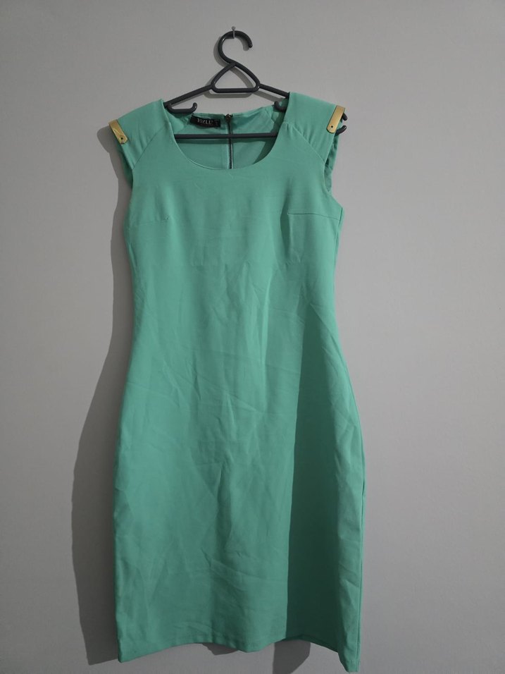 Turkuaz renkli, kemerli ve kolye kesimli midi boy kadın elbise. Düz ve sade tasarımıyla ofis kullanımı için uygundur.