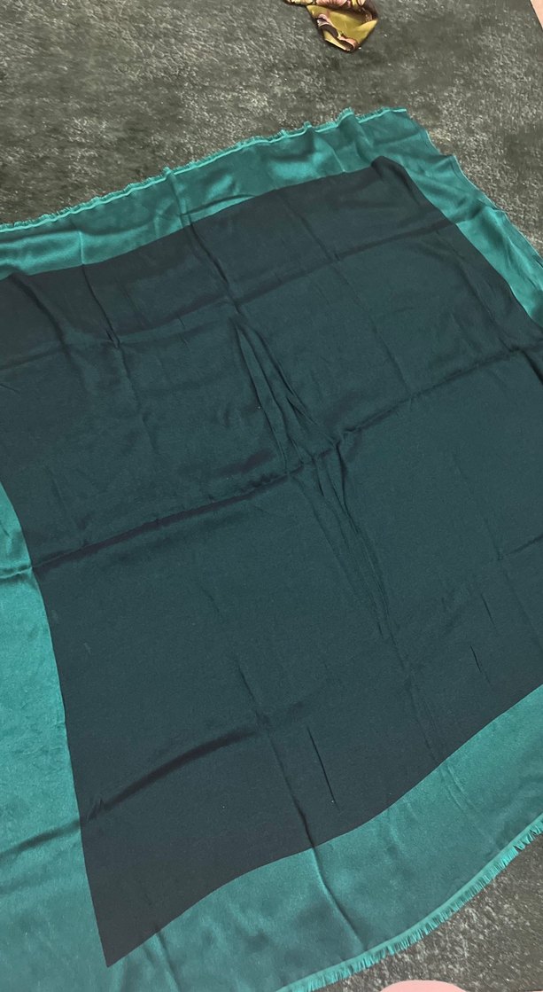 İpek dokulu, koyu renk ortası ve turkuaz kenarı olan kadın fular. Drapeli ve minimalist bohem tarzda.