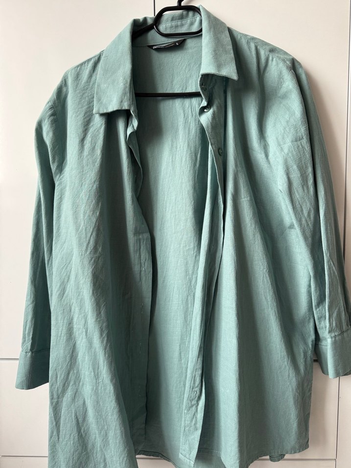 Turkuaz keten kumaştan, düğmeli, notalı yaka ve uzun kollu, bol kesim kadın gömlek. Minimalist ve normcore tarzda, günlük kullanım için uygundur.