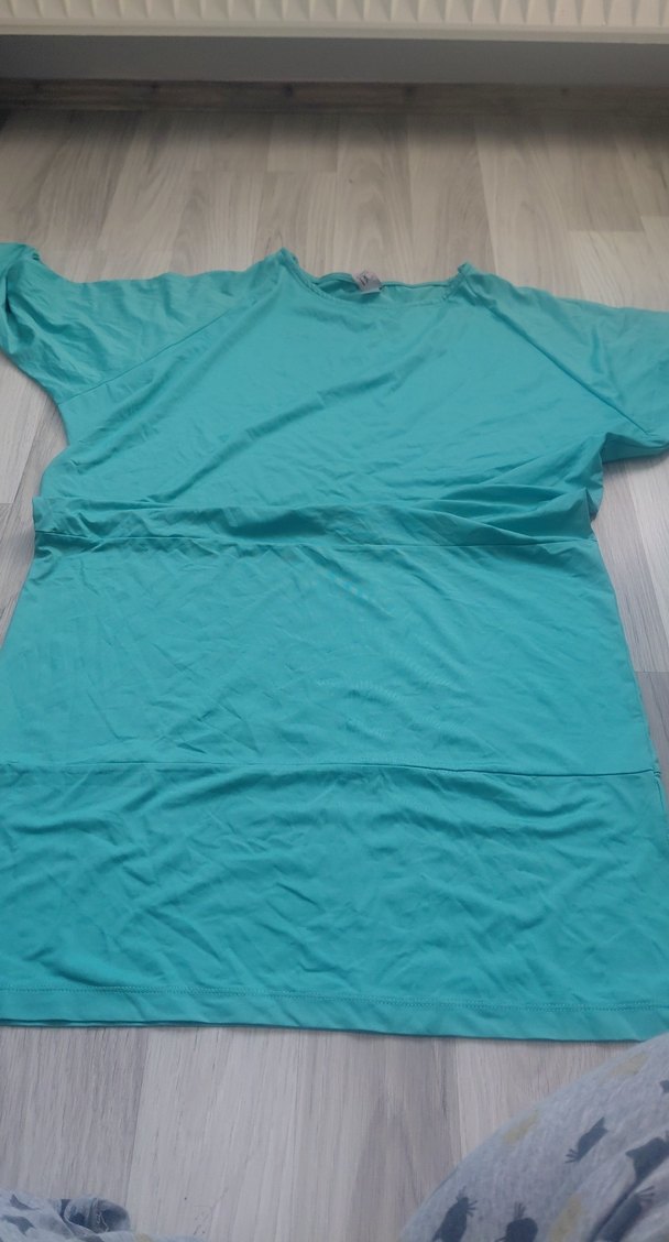 Salaş kesim, turkuaz keten hamile tişörtü. Yuvarlak yaka, kısa kollu ve drapeli tasarıma sahiptir. Normal midi boyda, günlük kullanıma uygundur.