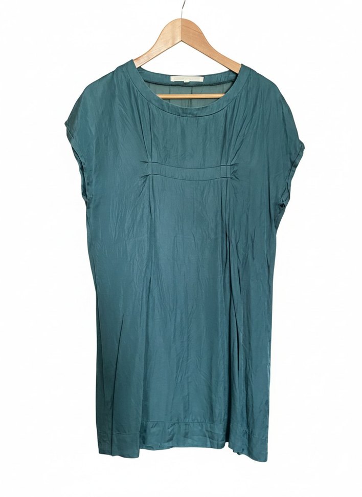 Turkuaz renkte, kısa kollu, keten kumaştan salaş kesim hamile tunik. Drapeli detaylı, midi boyda ve yuvarlak yakalı günlük kullanım için uygun.