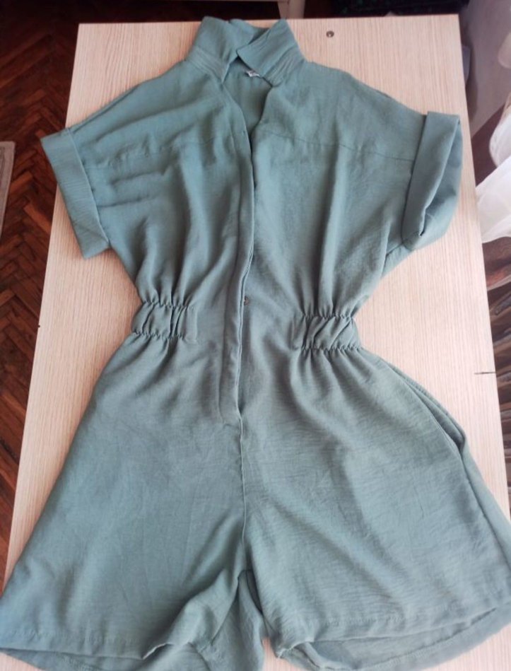 Turkuaz renkte, V yaka ve düğmeli ön kısmı olan bol kesim kısa keten tulum. Kısa kollu ve bel kısmı lastiklidir.