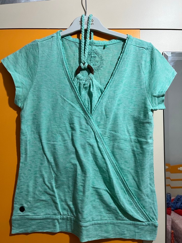 Turkuaz keten kumaştan, V yaka ve kısa kollu, boyundan bağlamalı detayı var. İki kere giyildi. Temiz ve hasarsızdır. Sokak modasına uygun rahat bir seçenek.