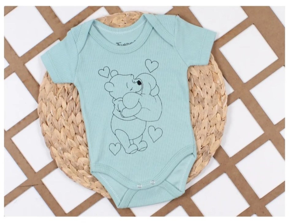 Turkuaz renkli, kısa kollu ve bisiklet yaka bebek body. Pamuklu örme kumaştan, üzerinde sarılan ayılar ve kalpler desenli baskı bulunur.