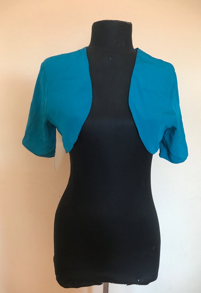 Kısa kollu, kumaştan yapılmış turkuaz renkli, vücuda oturan bolero. M beden