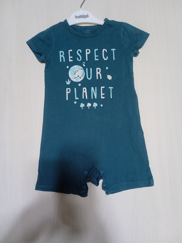 Turkuaz renkli, kısa kollu ve yuvarlak yakalı, yumuşak örgü kumaştan yapılmış erkek bebek tulumu. Önünde 'Respect Our Planet' baskısı bulunur.