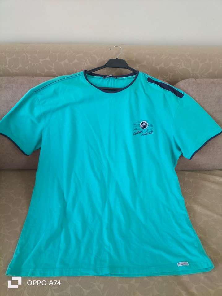 Turkuaz renkte, kısa kollu, yuvarlak yakalı erkek tişörtü. arkada küçük lekesi dışında hiçbir sıkıntısı yoktur kesinlikle Rahat kesimi ve gündelik kullanıma uygun, yumuşak ve Pamuklu kumaştan üretilmiştir. ️