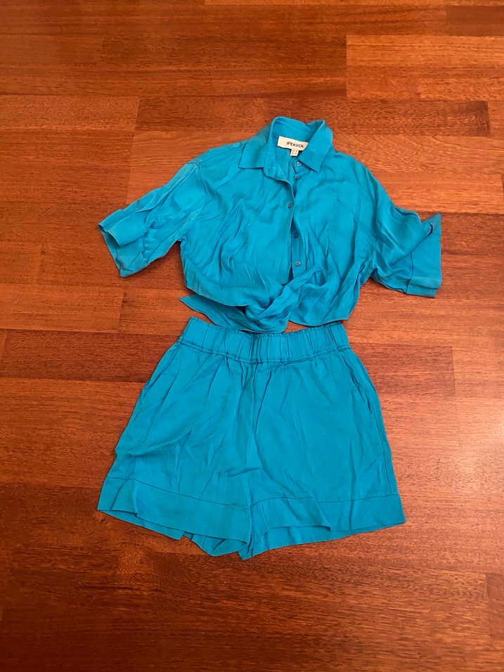 Turkuaz renkli, kısa kollu, düğmeli ve yakalı mini şort takim. Rahat kesimi ve yumuşak keten kumaşıyla günlük kullanıma uygun.