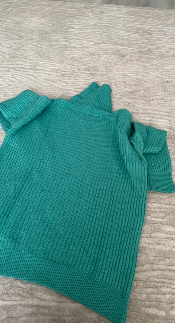 Turkuaz renkte, kısa kollu ve boğazlı, örme kumaştan yapılmış, vücuda oturan kadın kazak. Rahat ve günlük kullanıma uygun sokak stili kazak. Desensiz ve normal boyda.