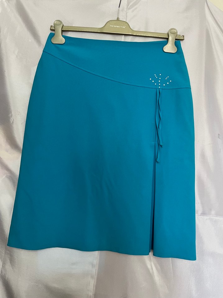 Turkuaz renkli, pilili ve nakış detaylı mini etek. Parlak sentetik kumaştan üretilmiş, bol kesim ve çağdaş tarzda günlük kullanıma uygun.