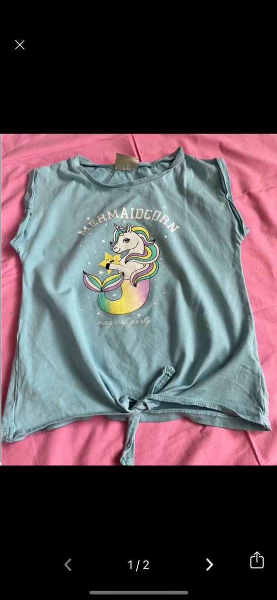 Baskılı unicorn desenli, kısa kollu ve yuvarlak yaka kız çocuk tişörtü.